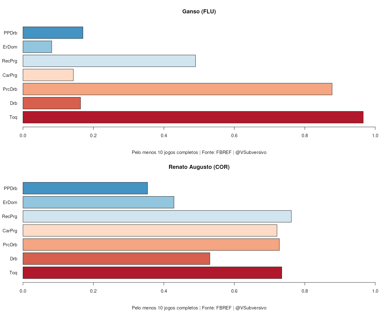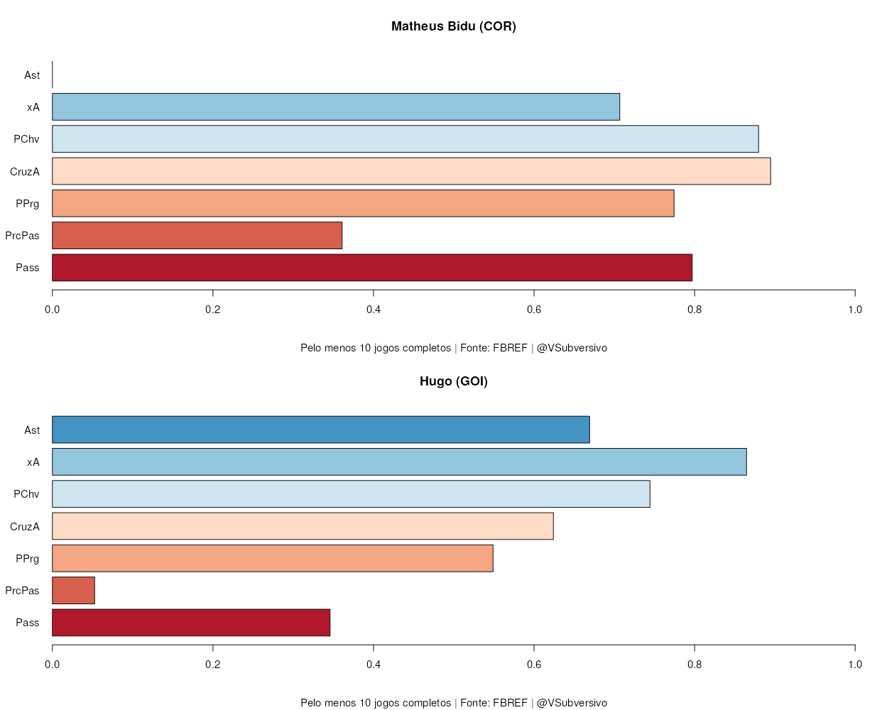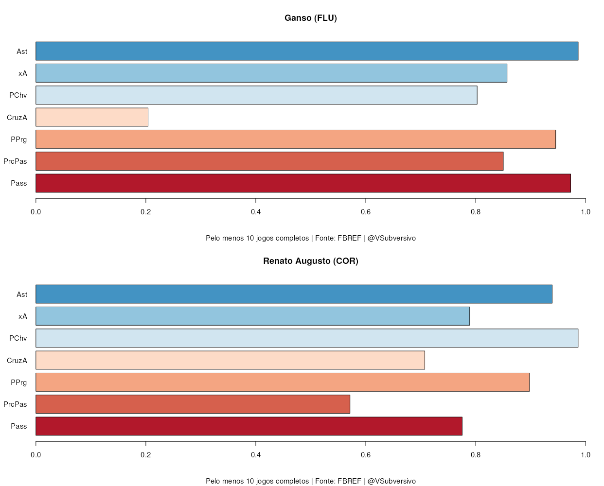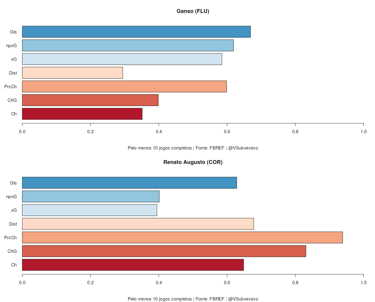 Como podemos ver, Renato finaliza mais do que Ganso, assim como acerta mais as bolas no alvo. Contudo, as chances de Ganso são mais claras, tendo-se um xG maior que o acumulado por Renato (0.08 x 0.12, por 90 min) e uma distância média menor de finalização (22.8 x 19.1). O quanto isto se deve ao jogador ou ao clube não é fácil precisar exatamente, mas, se o maior xG de Ganso se transferir de alguma forma para Renato, o futuro promete para o torcedor tricolor. Tais chances, se forem apresentadas para o craque, certamente serão aproveitadas e veremos um aumento significativo em seu número de gols. Note-se, também, que muito dos “baixos” números de Renato não são por falta de qualidade, mas bastante se deve ao azar (por exemplo, seu PSxG acumulado é de 3.1, enquanto teve apenas 2 gols, enquanto Ganso acumula 3.03 destes, com 3 gols) e ao desempenho geral ruim de sua equipe.