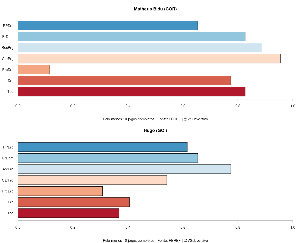 Tal procedimento é necessário porque, se formos olhar para os dados absolutos, iremos favorecer aqueles que jogaram mais jogos; e, se não utilizarmos o percentil, teremos valores muito diferentes que tornarão difícil visualizar as estatísticas em conjunto. Também evitaremos utilizar os radares, tão popularizados no meio futebolístico, porque eles dificultam a comparação entre os diferentes níveis dos jogadores: um gráfico de barras horizontal, seguindo o que é mais confortável para nossos olhos, é mais adequado para interpretar os dados.