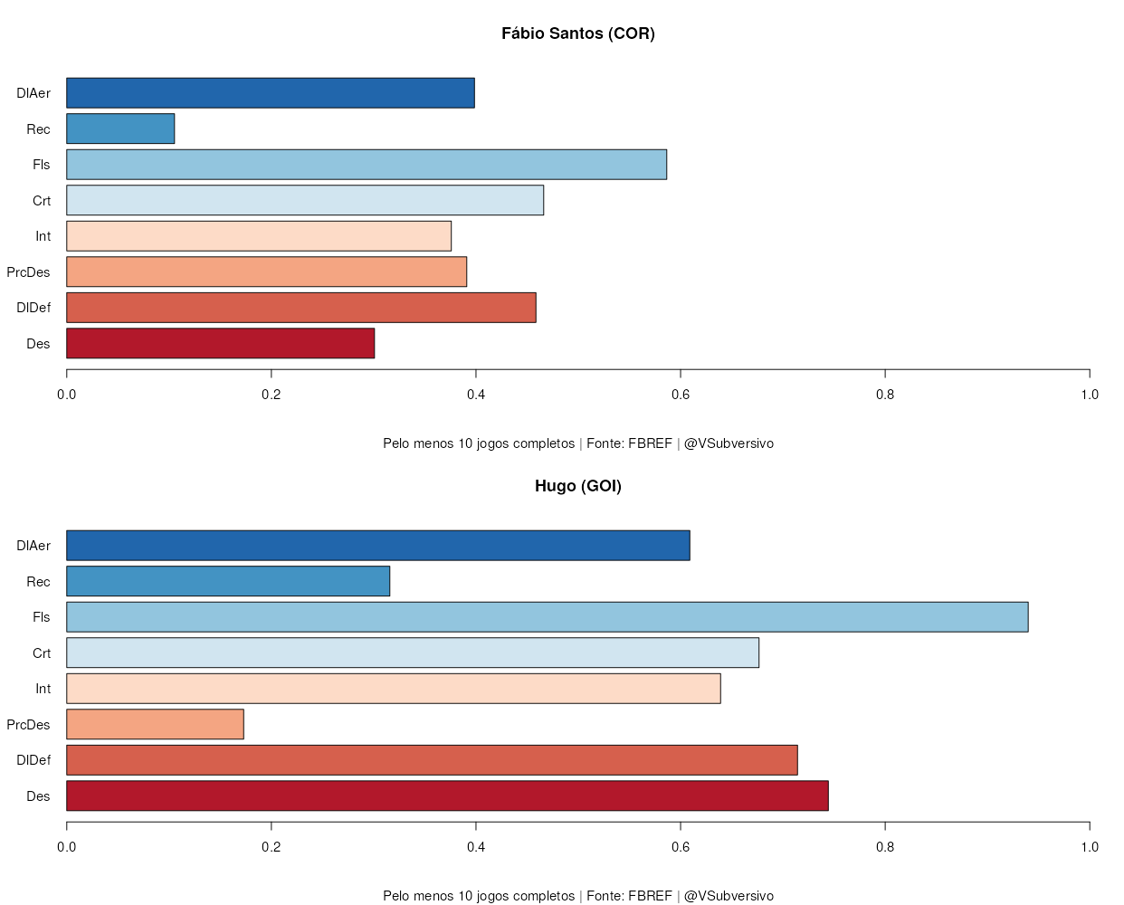 Neste caso, os números ajudam bastante a mostrar as características do jogador. Comecemos pelo lado defensivo, ao compará-lo com Fábio Santos: