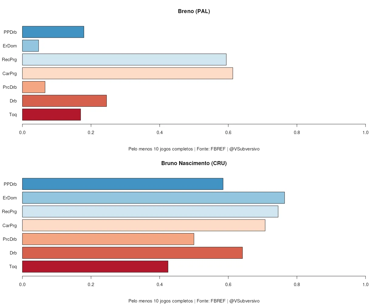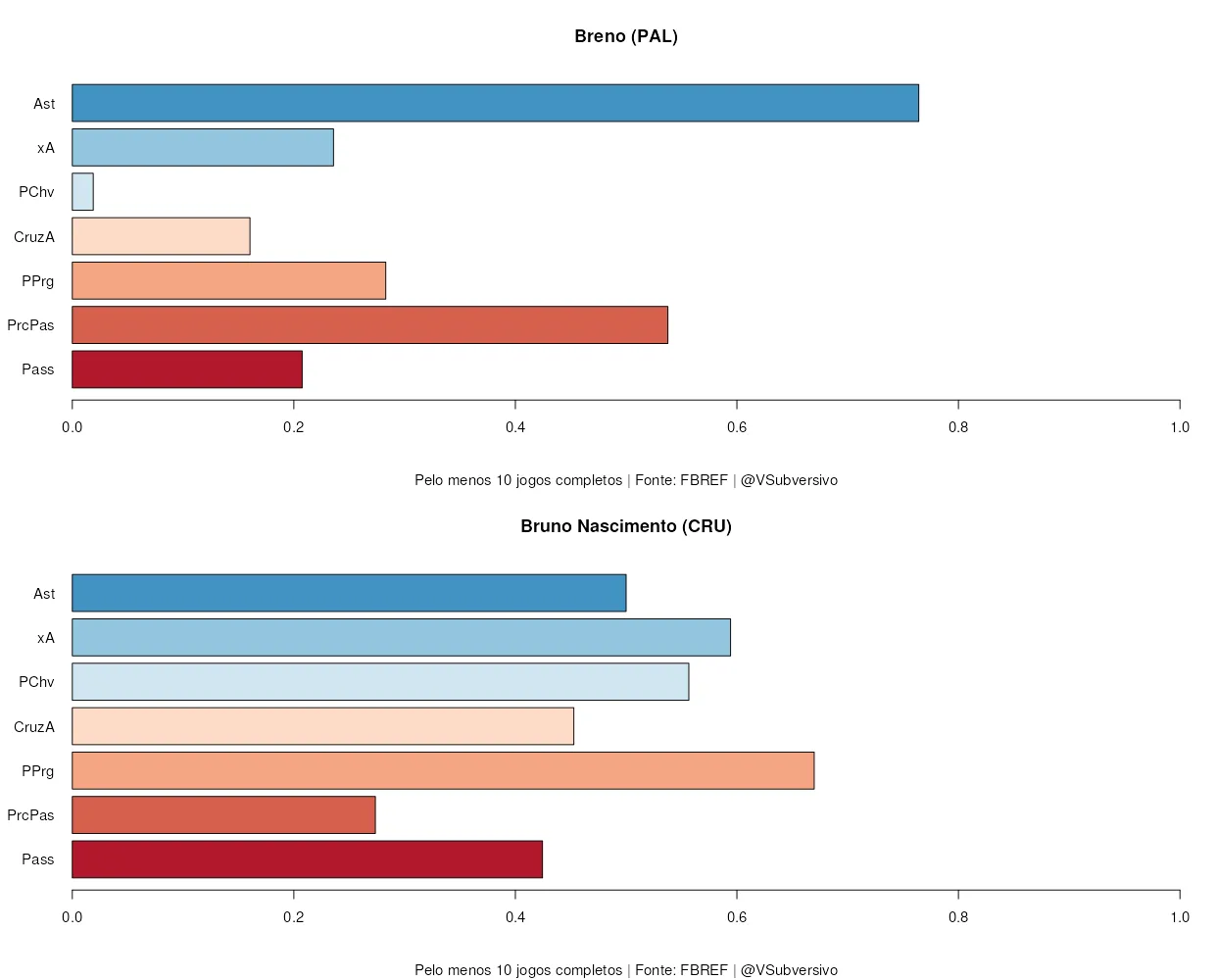 Bruno é bem mais agudo que Breno: busca muito mais dribles, tem maior precisão nestes e recebe mais bolas à frente. Além disso, se demonstra mais envolvido no jogo, o que o coloca muito mais como um construtor do que um finalizador, que tende a se isolar na área. Isto demonstra, então, que um papel bem mais adequado para ele seria o de ponta ou de segundo atacante, ainda mais quando comparamos com os números de seu futuro companheiro. Ele precisa deste espaço para correr e fazer a diferença com seus dribles, os quais podem garantir uma vantagem significativa no contra-ataque.
