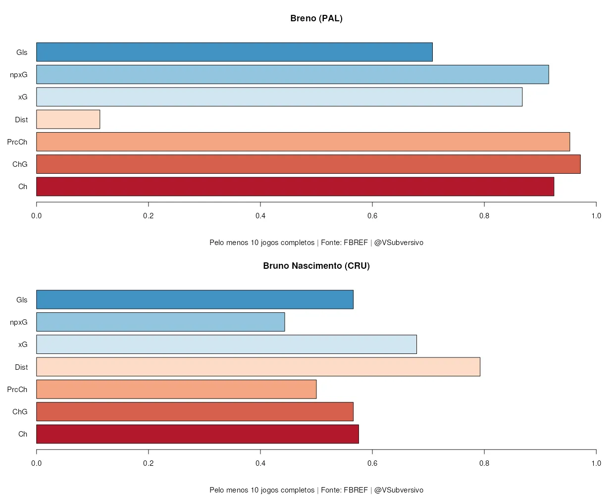 Bruno claramente não possui o mesmo volume ofensivo de Breno, ainda mais se considerarmos que prevalecem chutes de longe e seus gols vieram em boa parte de cobranças de pênalti. Isto demonstra que o novo atacante do Palmeiras tenderá a ter dificuldade para cumprir o papel de infiltração nos espaços feito por Rony, que consegue realizar este papel com qualidade. Contudo, mesmo que os números presentes pareçam colocar Bruno Rodrigues como um finalizador ruim, este não necessariamente é o caso, ainda mais se considerarmos seus valores de gols esperados: chutando de longe, é esperado que se tenha mais erros de finalização. Além disso, ele apresentou uma boa eficiência ofensiva (sem considerar pênaltis).