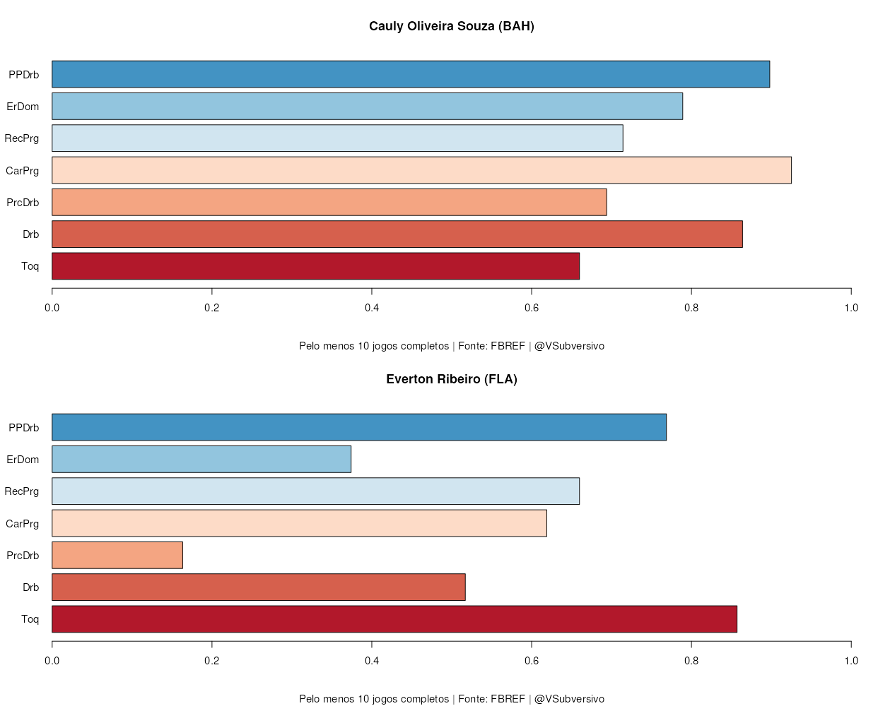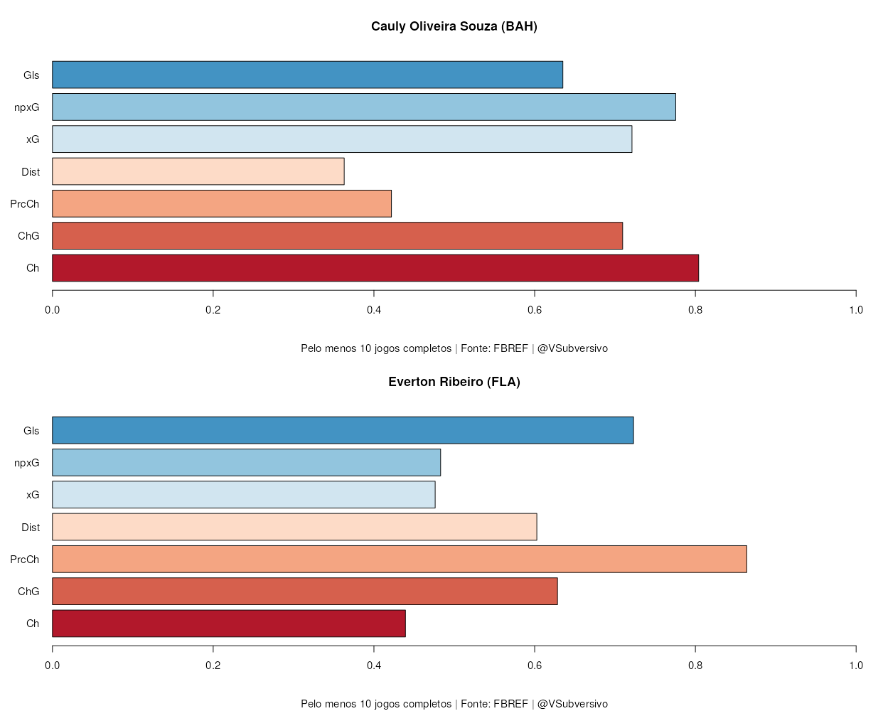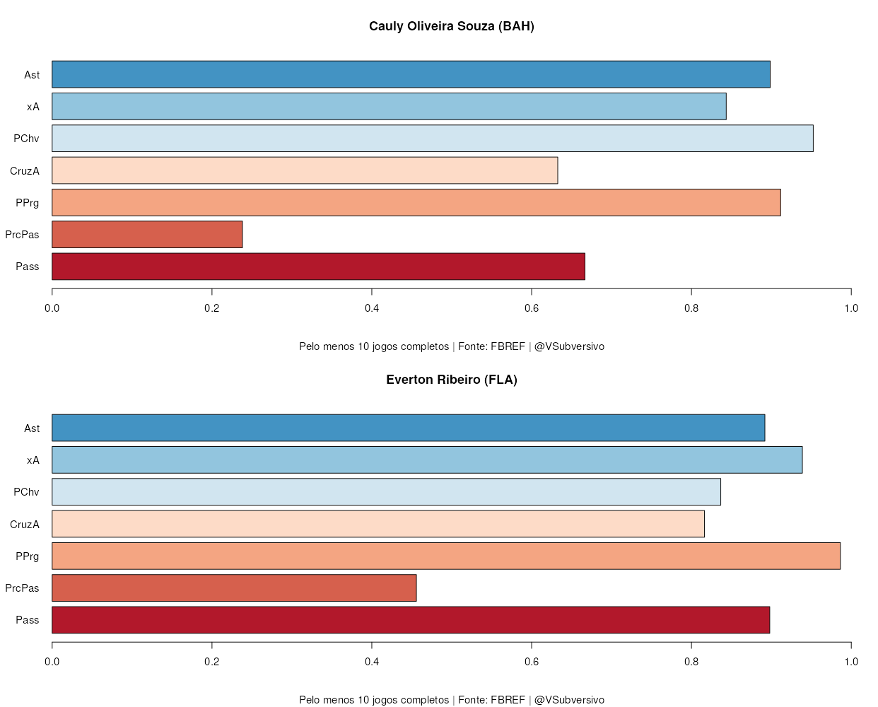 Como fica claro, ambos meio-campistas baianos são excelentes na criação de jogadas, com alguns destaques a mais para Everton quando falamos de número de passes, passes progressivos e cruzamentos na área. Isto indica, então, que ele se acomodaria bem em uma posição mais recuada, tendo o papel de realizar mais passes e encontrar espaços para o jogo da equipe, com um foco especial em passes que quebrem as linhas. Jogadores que se adiantam muito obviamente não possuem tantos passes progressivos, o que mostra que Everton e Cauly exercem papeis diferentes na criação.