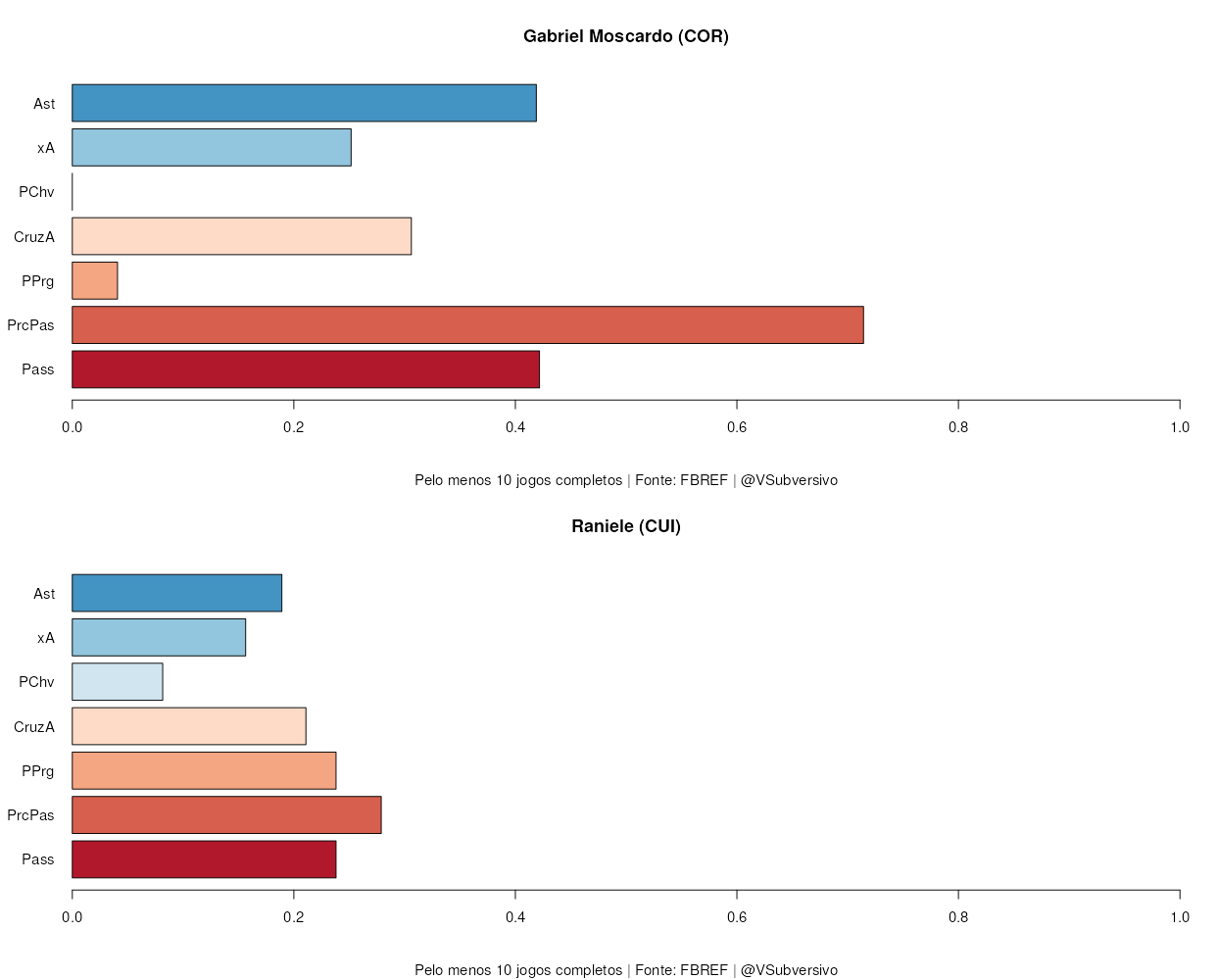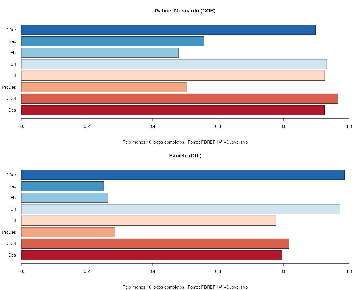 Como podemos ver, há diferenças: Raniele possui mais duelos ganhos, bloqueios e cortes, enquanto Ralf tinha mais interceptações e duelos totais. Os números, contudo, não são tão distintos, e, na verdade, o novo jogador do Corinthians parece ser um jogador mais qualificado para o jogo aéreo, mesmo que Ralf não fosse, de forma alguma, deficiente nesta área.