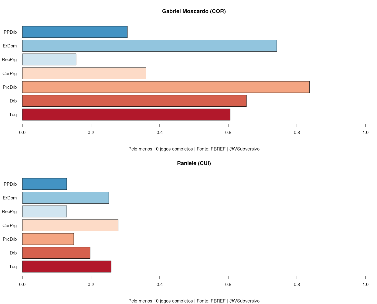 Moscardo é muito mais driblador que seu substituto, tendo mais dribles, maior precisão e um pouquinho mais de progressão. Novamente, a consideração sobre a posse é importante, mas não faz muito sentido esperar que Raniele seja o maior driblador e limpe as jogadas como o jovem da base corintiana o fazia. Este talvez seja um dos grandes motivos que o fez ser cobiçado pela Europa: a capacidade de sair jogando é simplesmente absurda para um jogador com a sua idade.