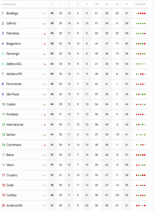 A rodada nº 33 do campeonato brasileiro de 2023 terminou na quinta-feira desta semana (10/11/23) e, com ela, o Botafogo se encontra em apuros, com o pesadelo de perder seu título, após uma campanha histórica do primeiro turno, cada vez mais real. A equipe já se encontra empatada em pontos com o Palmeiras e Grêmio e ainda tem pela frente o Bragantino, em confronto direto pelo título, fora de casa. Você pode dar uma conferida na tabela logo abaixo: