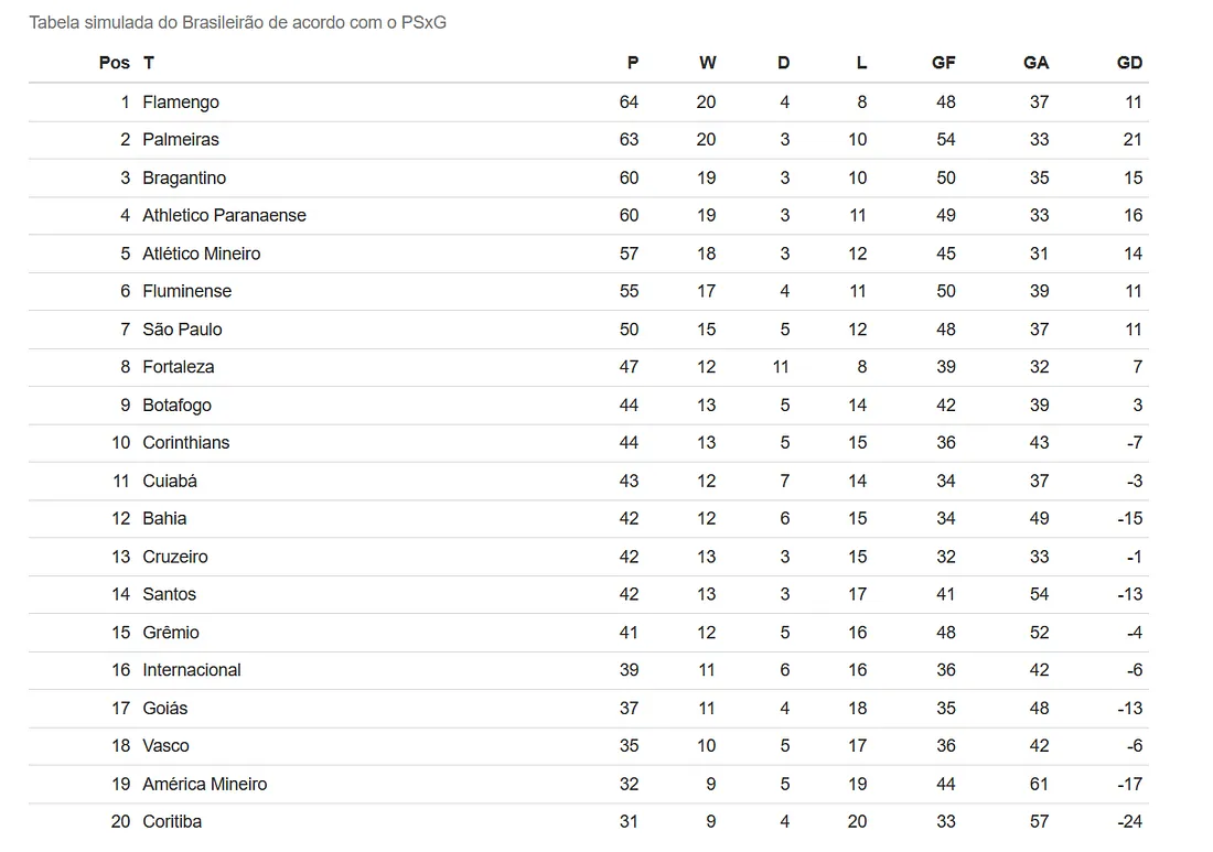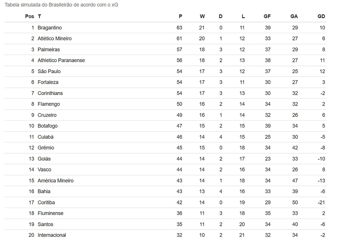 Outro elemento interessante a ser notado é que há uma diferença muito grande de gols: o Bragantino, nesta simulação, teria o melhor ataque, com 39 gols. Na realidade, o time com o melhor ataque é o Grêmio, ambos com 57 gols, em uma diferença de 18 gols! Isto significa, obviamente, que as equipes tendem a finalizar melhor em suas chances e, talvez, os goleiros não tenham um desempenho tão bom — esta última constatação, contudo, será melhor analisada com o PSxG.